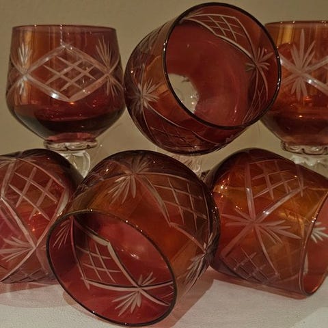 Et særligt sæt bestående af seks små krystalglas i en eksklusiv rød farve, ideelt til at imponere, meget eftertragtede, meget værdifulde.
