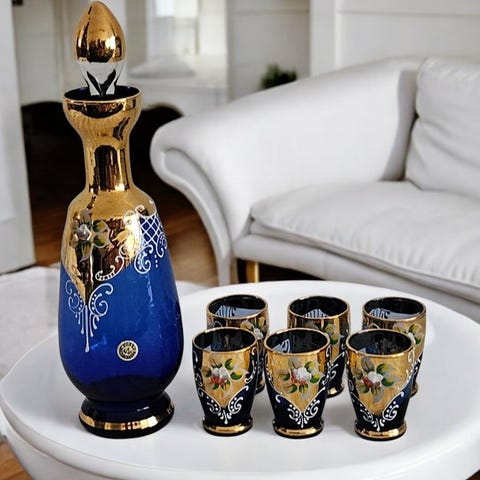 Pragtfulde krystalglas, yderst sjældne, kendetegnet ved indviklede gyldne dekorationer, ædelt glas og 24 karat guld.