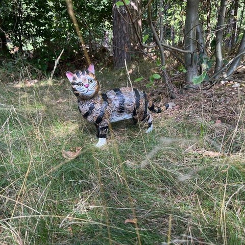 et færdiglavet skulptur af sølv-brun bronze kat med slips og solbriller
