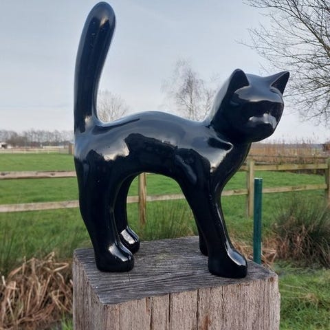 En polyresin-skulptur af en sølvbronse kat med slips og solbriller, oprindelse Europa, 29 cm høj, 15 cm bred, 17 cm dyb, ikke signeret og i fremragende stand. Klik på den blå "gå til varen" knap, for at købe eller byde på denne vare. Den samlede pris vil blive vist inden du afgiver dit bud.