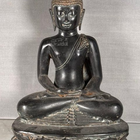 Bronzet tibetansk alterbuddha i patineret bronze fra Qing-dynastiet (ca. 1700–1750); solid figur på 13 cm høj, 7 cm bred og 4 cm dyb, vægt 411 g, bagsiden med tibetanske tegn, generelt god stand med mindre slid. Klik på den blå "gå til varen" knap, for at købe eller byde på denne vare. Den samlede pris vil blive vist inden du afgiver dit bud.