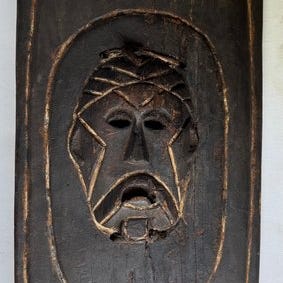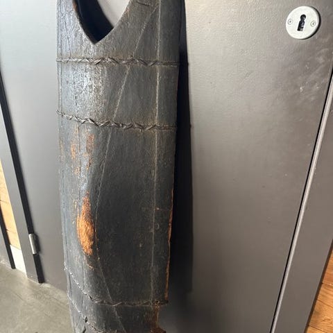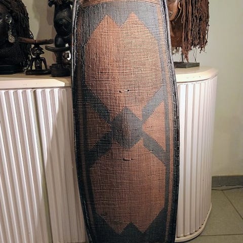 Ngbandi skjold fra Den Demokratiske Republikken Congo, ca. 1900–1910, lavet af flettet værk, træ og pigmenter, 138 cm høj og 51 cm bred, provenance Danny De Waele (Belgien) med certifikat på ægthed. Klik på den blå "gå til varen" knap, for at købe eller byde på denne vare. Den samlede pris vil blive vist inden du afgiver dit bud.