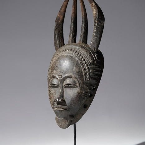 En Baule træmaske fra Daoukro, Elfenbenskysten, autentisk original med stand; højde 29 cm, vægt 920 g, i rimelig stand. Klik på den blå "gå til varen" knap, for at købe eller byde på denne vare. Den samlede pris vil blive vist inden du afgiver dit bud.