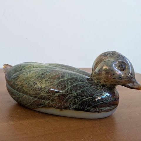 Renato Anatra Figura med Mantel er en håndsigneret Murano-glaskulptur i kobaltblå med hoved af smaragdgrøn, produceret i 1982 som en del af Studio Zanetti-limited-udgaven, måler 12 x 30 x 12 cm, vejer 2,2 kg, lavet i Italien og i fremragende stand. Klik på den blå "gå til varen" knap, for at købe eller byde på denne vare. Den samlede pris vil blive vist inden du afgiver dit bud.