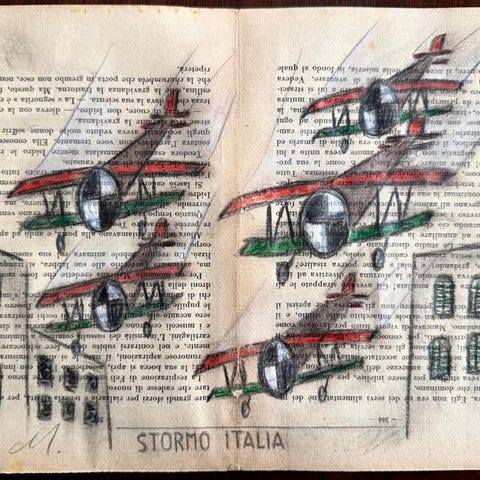 Unik værk udført i blyant, pasteller og akvareller, på en side fra Domenica del Corriere fra 1934, ca. 40x30 cm (værket har ganske generøse dimensioner).