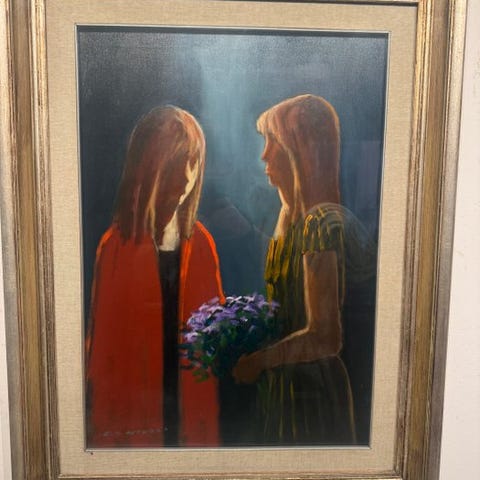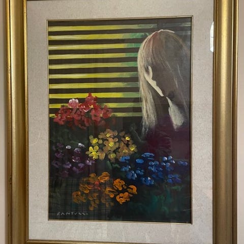 Maleri i oljemaling på lærred af maleren Eliano Fantuzzi (Modena, 25. september 1909 – Verona, 24. maj 1987), der forestiller en blomsterhandlerinde med buketter af blomster, som trist kigger på en tom bænk uden elskende at sælge til. Lærredet måler 50x70 cm og inklusive ramme 63x83 cm. Vil blive afsendt i passende beskyttende emballage og med tilhørende certifikat for ægthed.