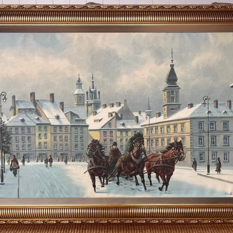 Het doek meet 60/50cm, met lijst 75/65cm en kan enkel afgehaald worden in Westerlo.