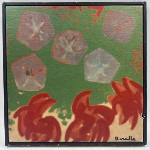 Det foreslåede værk er en Frottage fra 1972 af MIMMO ROTELLA (1918-2006), som har ladet sig inspirere af Max Ernst; kunstneren udtrykte sig også gennem Frottage. Dette værk er udført på papir på 65x50 cm, monteret, signeret og indrammet. Galleria Pandolfini (Firenze) har i kataloget udtalt, at kunstneren har bekræftet ægtheden af værket. Spedizione Assicurata Poste-Italiane.