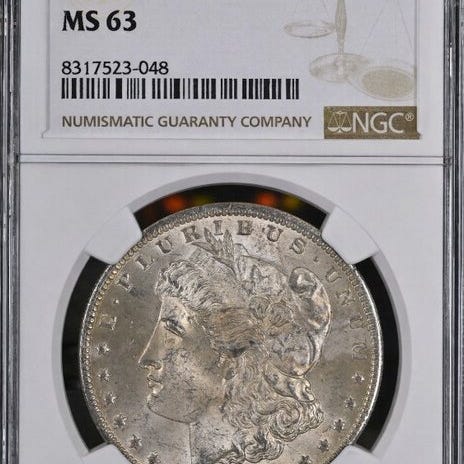 Mønt af typen "Morgan Dollar" præget i Philadelphia møntværk. På framsiden ses busten af frihedens personifikation, designet af George T. Morgan. På bagsiden er en ørn med klædt sår, der holder en olivengren og en bunke pile. Det er en af de mest ikoniske mønter i amerikansk numismatik fra det 19. århundrede.