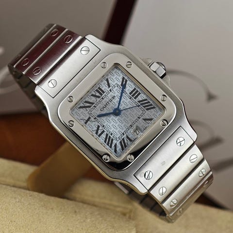 Kasseformen er let buet (“galbé”), designet til at sidde mere behageligt på håndleddet end originalen Santos