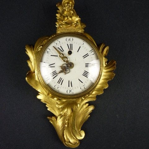 Sjældent vægur i udskåret træ, forgyldt med bladguld i 24 karat, i Louis XVI-stil. Forgyldningen er i fremragende stand; enkelte steder lidt mindre forgyldning.