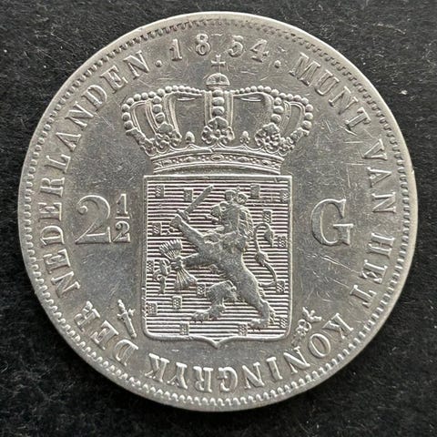Halve Gouden Willem 1851, blev tidligere fejlagtigt omtalt som 5 Gulden eller Halve Negotiepenning (Sch. 548/R) - V Brystbillede Willem III til venstre, omskrift: WILLEM III KONING DER NED. G.H.V.L. / Kz. Kronet hollandsk våben mellem egetrægrene, derunder mønt- og møntmestertegn.