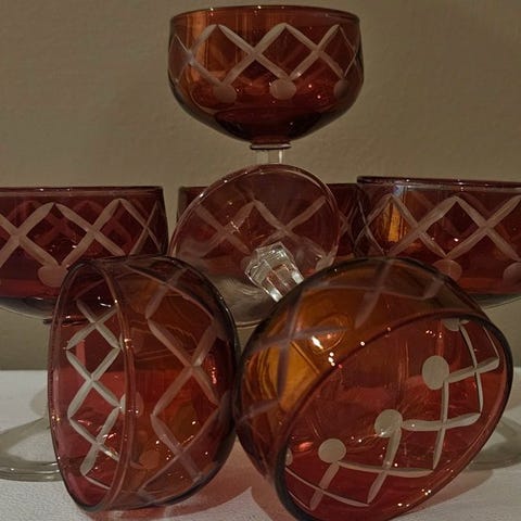 Et raffineret sæt af seks krystalglas i en eksklusiv rød farve, ideelt til at servere brandy eller cognac, meget eftertragtede.