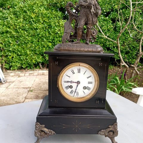 Pendeluret præsenterer en figurativ scene med to figurer fra 18. århundredes stil, der indrammer urskiven: