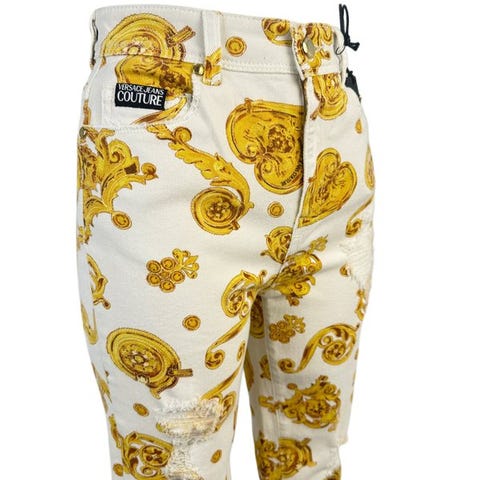 Versace Jeans Couture hvide damesjeans i størrelse 26 (XS), lavet af blandet stof med bomuld, nye med mærkat fra Italien, model Iconic Studs med nitter og krystal og to guldbælter. Klik på den blå "gå til varen" knap, for at købe eller byde på denne vare. Den samlede pris vil blive vist inden du afgiver dit bud.