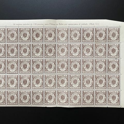 Spanien 1940 - Helt ark med 50 frimærker, 1. klasse, 150 pesetas, prøve 000. ...