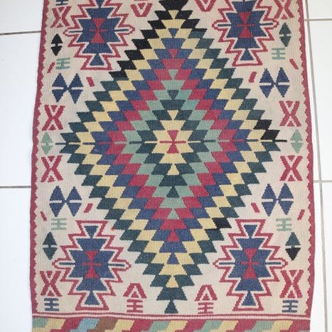 Det er et tæppe, der er vævet med traditionelle motiver fra Yuruk-regionen.