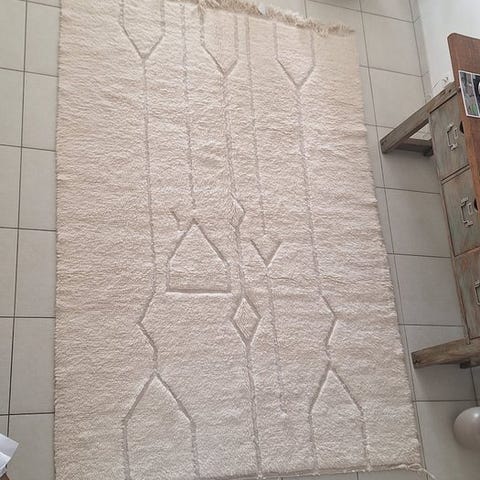 Forær dit hjem en æstetisk oplevelse med dette tæppe Beni Ouarain i écru ensartet, prydet med store romber subtilt integreret i vævet. Håndlavet med ren uld af enestående kvalitet, byder tæppet på en blødhed og en luftig tekstur, der ikke kan måle sig. Tidløst og alsidigt passer det perfekt ind i alle indretningsstile, hvad enten de er moderne, traditionelle eller vintage. Den generøse størrelse gør det ideelt til en rummelig stue eller et stort soveværelse. Dette tæppe er meget mere end et dekorativt element: det er et ægte kunsthåndværk, båret af historie og know-how.