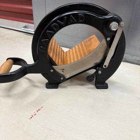 Det ikoniske brødskærer fra det danske mærke Raadvad. Model 294. Denne fås i den smukke og meget vintage mælkewhite med gyldne kroner og gyldne bogstaver. Et vidunderligt vintage-stykke med den rette patina.