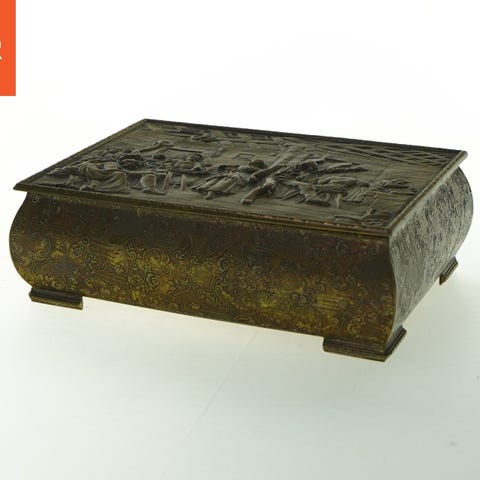 En stor cylindermusikboks fra ca. 1850–1900 af træ med messingdetaljer, mål 14 cm høj, 51 cm bred og 22 cm dyb; meget dekorativ og elegant, i god originals stand med original etui og testet og fungerer. Klik på den blå "gå til varen" knap, for at købe eller byde på denne vare. Den samlede pris vil blive vist inden du afgiver dit bud.