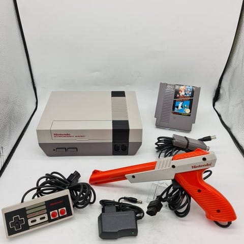 Nintendo NES 8-bit PAL-konsol fra 1985 i drift, inklusive Zapper, kabler, controller og det originale Duck Hunt-spil. Klik på den blå "gå til varen" knap, for at købe eller byde på denne vare. Den samlede pris vil blive vist inden du afgiver dit bud.