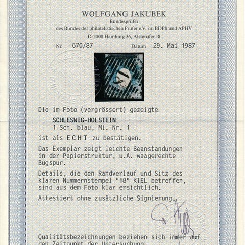 Oprindelse: Helgoland, 1873, ægte brugt farvefejltryk med 1/4 skilling grøn/raf, Michel Nr. 8F med fotoattest Lemberger BPP, Titel Der seltene Farbfehldruck, 1/4 Schillinge hellgrün/rot, ægte stemplet. Klik på den blå "gå til varen" knap, for at købe eller byde på denne vare. Den samlede pris vil blive vist inden du afgiver dit bud.