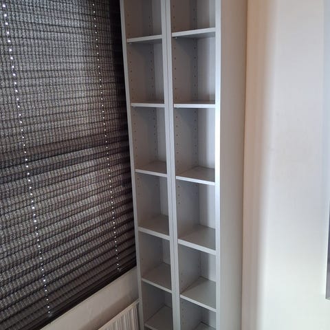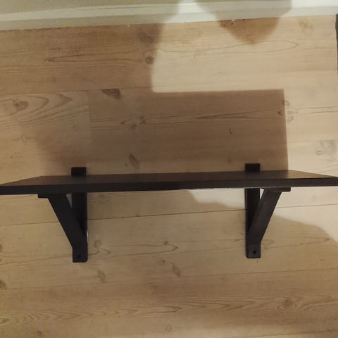 Anden reol, Ikea, 12 små sorte hylder til CD-rag fra Ikea - de måler 15 x 16 - kunne sættes i en hvid eller naturfarvet som kontrast / sender gerne