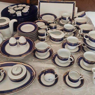 Royal Crown Derby – Old Imari 1128 – komplet 82-tallerkenskab med suppeterrine, låg til grøntsagsfad og serveringsfad. Komplet porcelænsservice