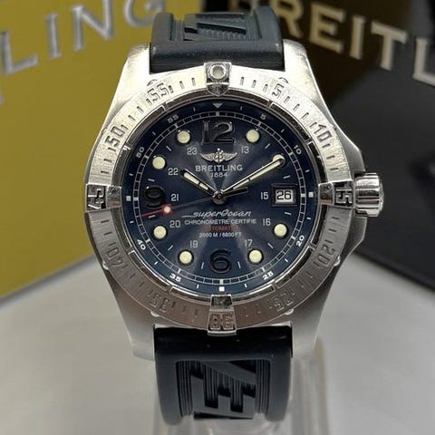Breitling SuperOcean Heritage 46, reference A17320, 2007, automatisk bevægelse, stålkasse, brun skive, diameter 50 mm, original brun gummirem, fuldt sæt med æske og papirer og original garanti. Klik på den blå "gå til varen" knap, for at købe eller byde på denne vare. Den samlede pris vil blive vist inden du afgiver dit bud.