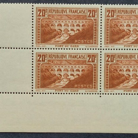 Frankrig; Pont du Gard, to lodrette par i en fire-tes blok, mint uden hæftning, fra 1929–1931, klassificeret som Yvert 262f, katalogværdi €2800+. Klik på den blå "gå til varen" knap, for at købe eller byde på denne vare. Den samlede pris vil blive vist inden du afgiver dit bud.