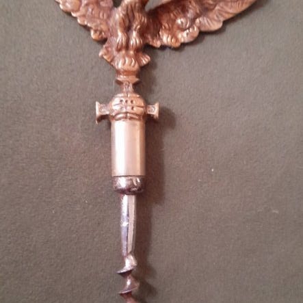 Vægmonteret proptrækker med tandstangsmekanisme på base af træ og støbejern. Fremstillet i Frankrig.
