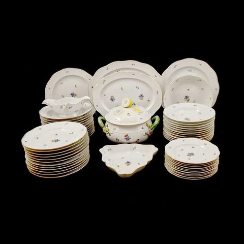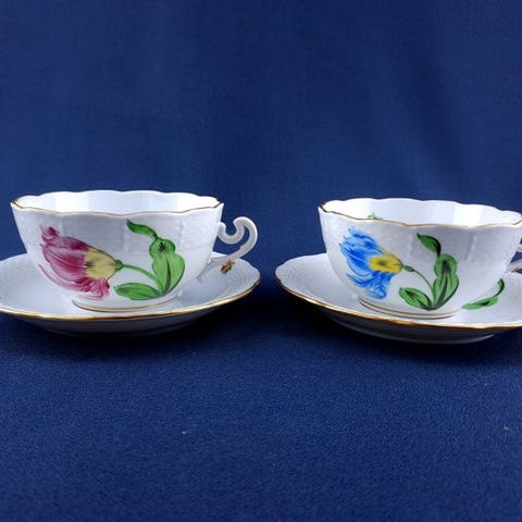 Fortryllende tesæt til 6 personer, produceret af Herend - “Rotschild”-samlingen, velkendt håndmalet mønster med fugle, der sidder på grene og spredte insekter, forgyldt kantning, i fremragende til næsten perfekt stand.