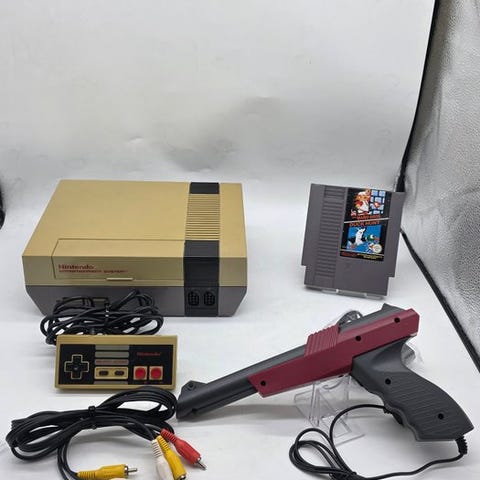 Limited edition Nintendo NES 8-bit klassisk spillekonsol (1987) i funktion, med controller, Zapper-pistol, Duck Hunt-spil og generisk strømforsyning. Klik på den blå "gå til varen" knap, for at købe eller byde på denne vare. Den samlede pris vil blive vist inden du afgiver dit bud.