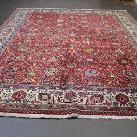 Oprindelse Tyskland. Maskinvævet Täbriz-tæppe, ca. 300 x 198 cm, bomuld på bomuld, dateret i midten af det 20. århundrede (ca. 1970), generelt i god stand med et område med revne. Klik på den blå "gå til varen" knap, for at købe eller byde på denne vare. Den samlede pris vil blive vist inden du afgiver dit bud.