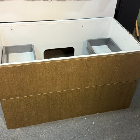 Velholdt hvidt badeværelsesunderskab med dobbeltlåger og to hylder. Hvis du har brug for plads på toilettet OG vil gemme rørføring væk er der udskæring til afløbsrør under vasken.