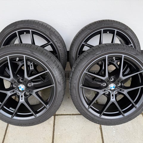 2 Michelin dæk med 4 mm mønster og 2 Sportiva Perform med 7-8 mm. Med tms ventiler