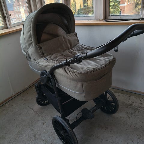 Basson Nordic Lux barnevogn, i farven Dusty olive. Vognen er blot et år gammel, og står nærmest som ny. Har været brugt dagligt de første par måneder, og har ellers stået inde. Ingen slid, fugt eller andet.