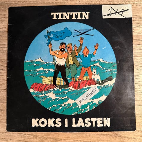 Tintin Den sorte ø lp plade på dansk. Klassisk Tintin-fortælling indlæst på vinyl. Omslaget viser motiv fra albummet med Tintin, Terry og øen i baggrunden.