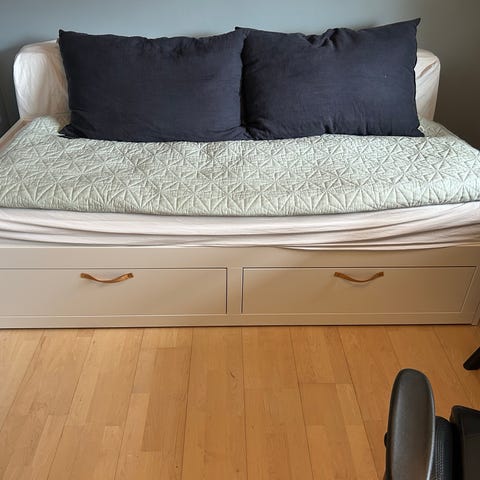 IKEA træk-ud seng med skuffer i hvid. Sengen er brugt og har et par synlige spor, men de ellers i god stand.