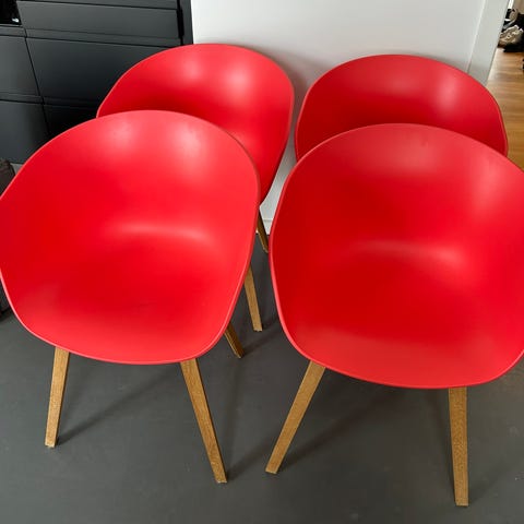 Seks styk. Almindelige brugsspor (se billeder). To af stolene er løse i samlingerne. Der medfølger læderhynder til alle stolene.