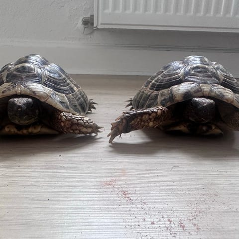 Vi har to skønne græske landskildpadder, en han og en hun, som nu søger et godt hjem, hvor de kan fortsætte med at trives. De er omkring 10 år gamle og har fulgtes ad hele livet, hvilket gør dem til et harmonisk og velfungerende par. De er begge sunde, aktive og i rigtig god trivsel.