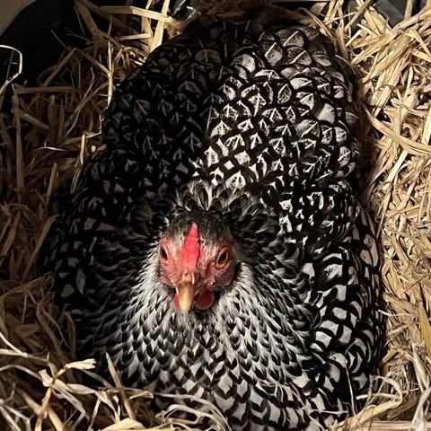 Skrukhøne med kyllinger Der er 11 kyllinger du kan få høne og kylling til 600 Kr er du interesseret så kontakt mig på 28299884