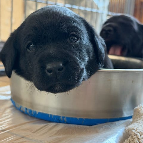 Vi går fuldtid hjemme med hvalpene, og kan derfor lægge alt vores krudt og kræfter i at miljøtræne og tilvænne dem hverdagens mange lyde og udfordringer.