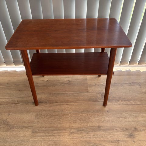 Bordet er udført i teaktræ med synlig træstruktur og har tre ben.