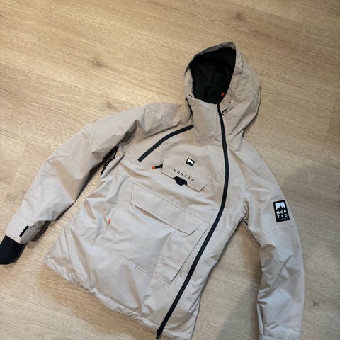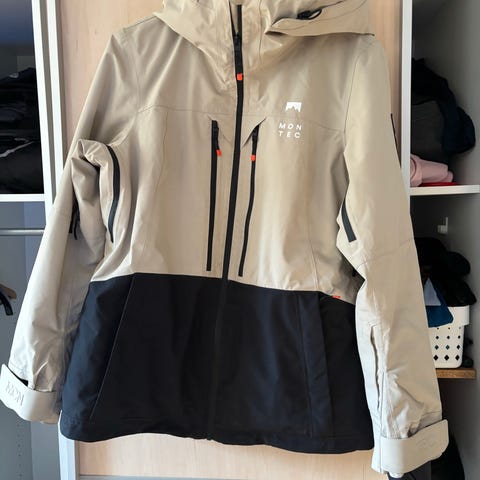 Montec skijakke i beige og sort farveblok-design. Jakken har hætte med snørejustering, høj hals og gennemgående lynlås med vindklap. Foran er der lommer med lukning, og ærmerne har justerbare manchetter. Egnet til ski og aktiviteter i køligt vejr.
