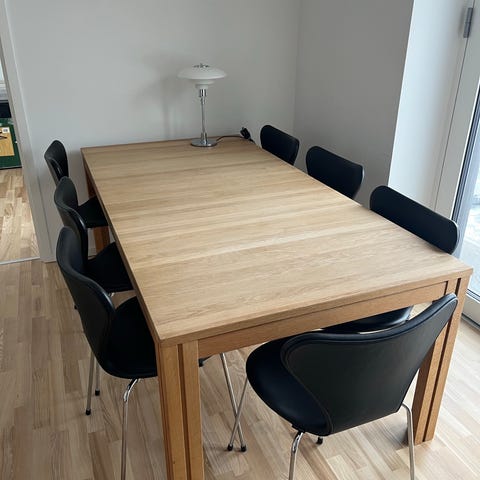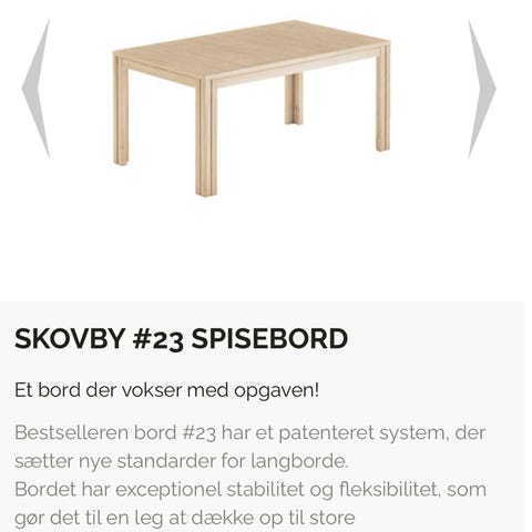 Danskproduceret Skovby SM 74 spisebord i eg (sæbebehandlet) med udtræksfunktion. Bordet har midterudtræk med ekstra plade, så længden kan justeres efter behov. Der medfølger to udtræksplader på 45 cm. Bordet kan derfor forlænges med 45 cm. eller 90 cm. Understellet består af to T-formede ben for stabil støtte. Nypris 21.000 kr.