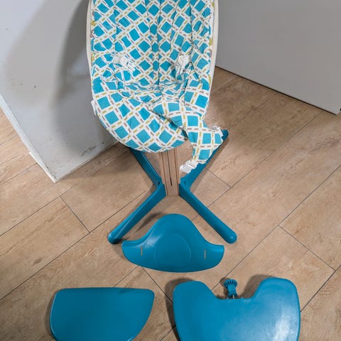 Nomi højstol. Den er brugt og der er også brugsspor som ses på billederne men den fungere stadig som den skal.