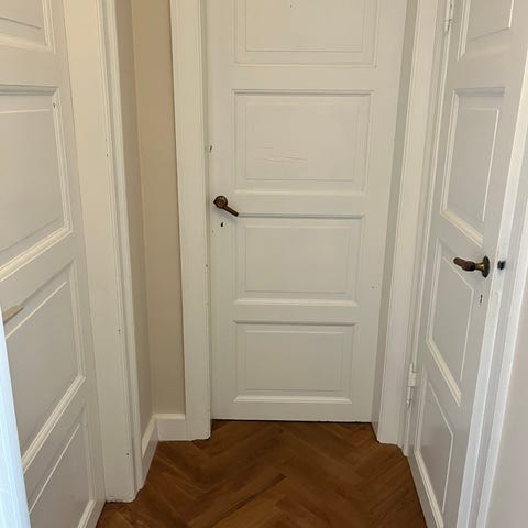 Hvid fyldningsdør med messinggreb og nøgle