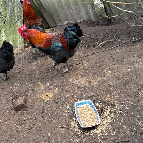 Zombie hane fra september 25. Orange/røde øjne, få sorte pletter på hvid fjerdragt. Forældrene er Ayam Cemani og hvid italiener. Han er vant til udeliv og bliver ved hønsegården.