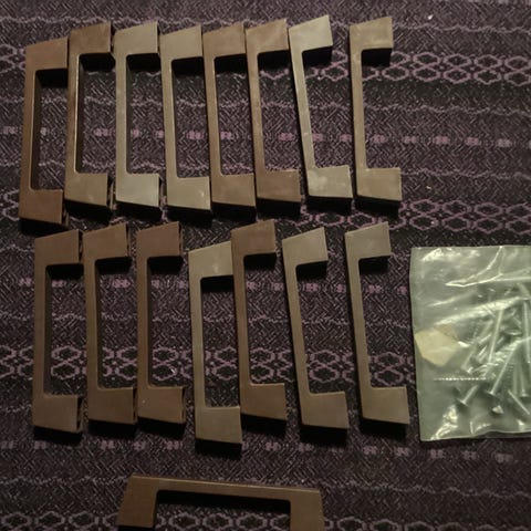 Alu greb til køkken. 11 stk 50cm, 3stk 70cm. 1 stk 40cm, samt greb til køleskab, 26cm i huller. Samlet til fast pris